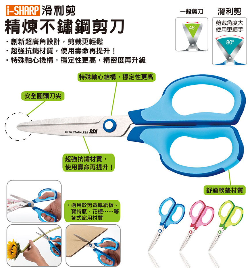 ? 创新超广角设计,,,,,,,剪裁更轻松 ? 超强抗锈材质,,,,,,,使用寿命再提升! ? 特殊轴心机构,,,,,,,稳定性更高,,,,,,,精密度再升级 ? 圆头式设计,,,,,,,使用最安全 ? 软握把设计,,,,,,,防滑又舒适